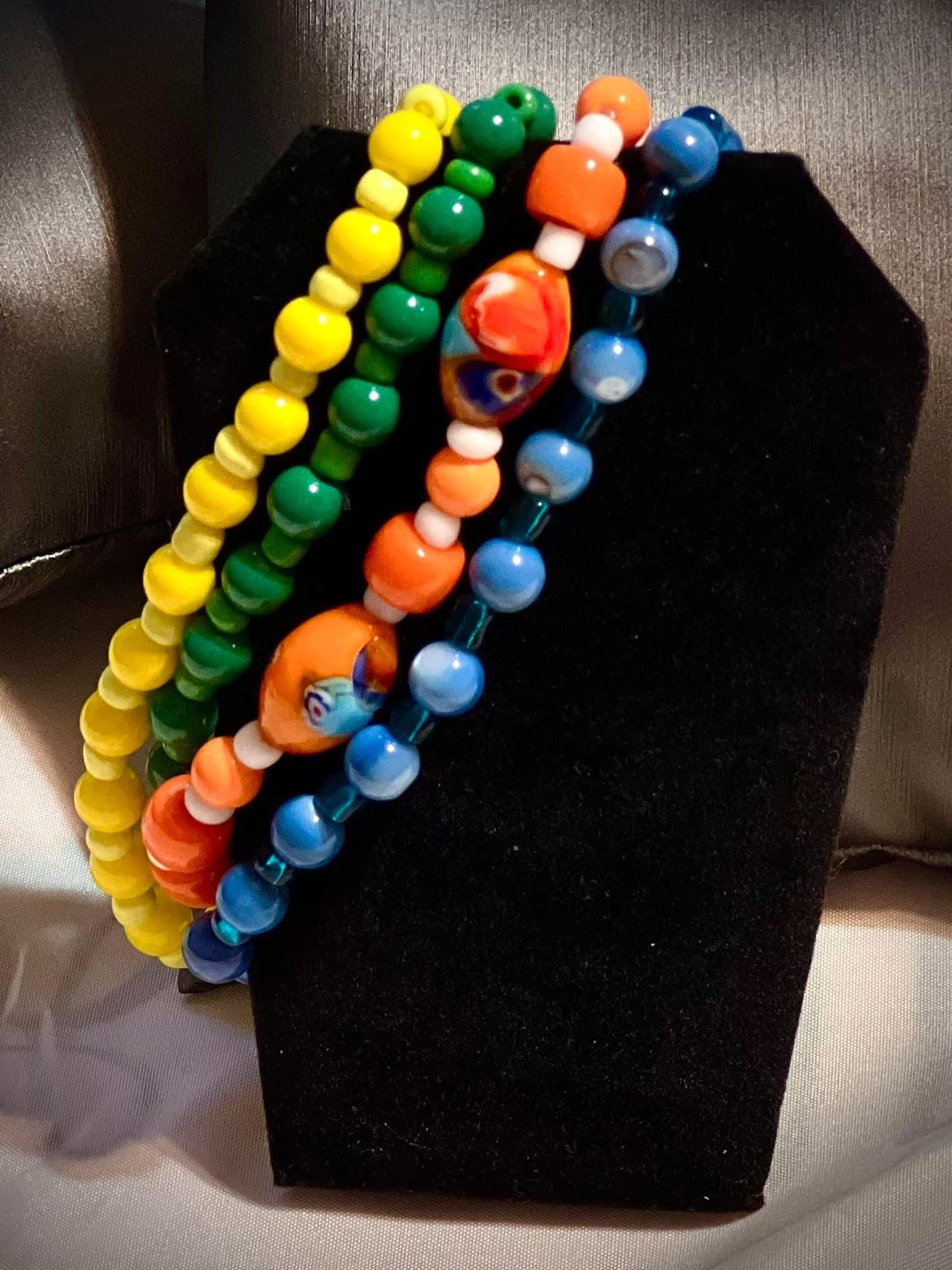 Colorful Glass Bead Bracelets – Handmade, Fun & Vibrant Add a pop of color to any outfit with these handmade glass bead bracelets! Featuring a mix of bright yellow, green, orange, and blue beads, each bracelet has its own playful personality. The multicolored patterned beads in the set add a unique, eye-catching detail that makes these bracelets stand out. Details: Material: Glass beads, durable stretch cord Colors: Yellow, Green, Orange, Blue, Multicolored accent beads Size: Stretch fit for most wrist sizes Style: Stackable, playful, and casual Handmade with care by TiTi's Design Perfect as a gift for yourself or a loved one, these bracelets bring color and joy to everyday wear. Stack them together or wear individually for a versatile look!