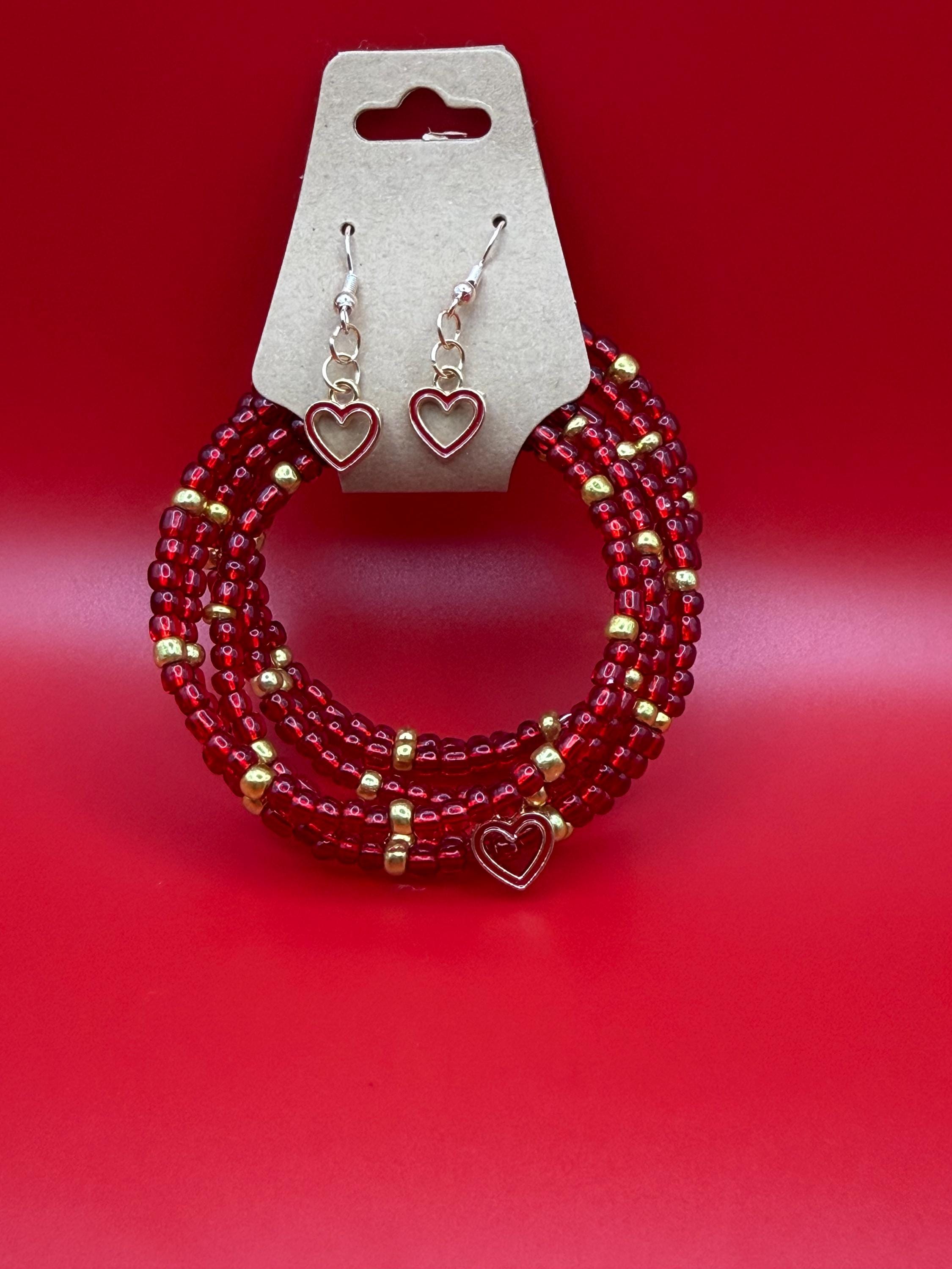 This wire bracelet made with red and gold ,glass sea beads. These are a great way to celebrate Valentine's Day with a cute little heart charm with matching earrings.